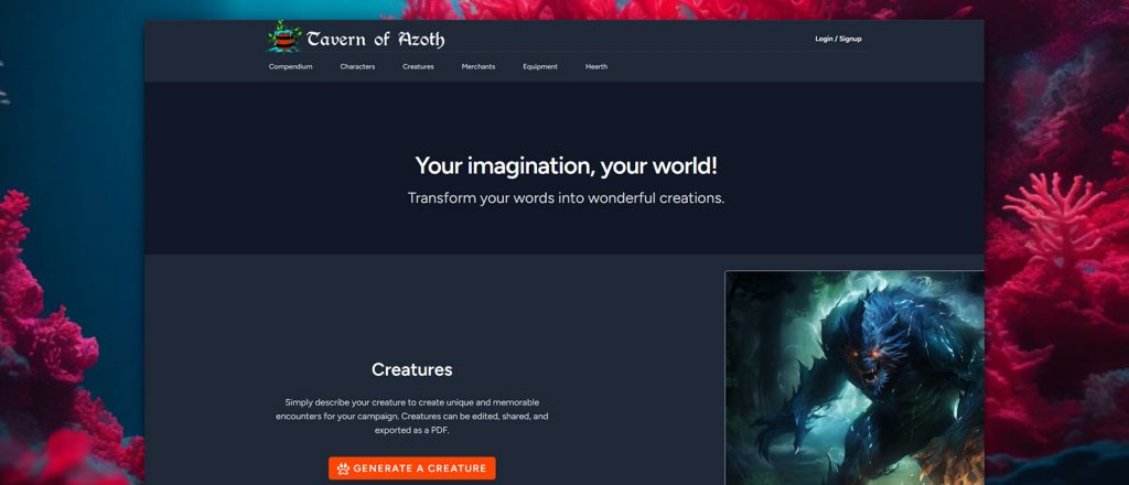 The Tavern of Azoth – це керована штучним інтелектом платформа для рольових ігор у фантастичному світі Азерота. Сайт містить енциклопедію з 300 тварин, генератор випадкових торговців та інструмент для створення власних речей. Користувачі можуть вільно переглядати енциклопедію істот, створювати унікальні зустрічі та створювати нових крамарів з окремими історіями та товарами для своїх кампаній. Вони також можуть надати своїм аватарам унікальне, миле спорядження, створене повністю в їхній уяві. Таверна Азота створена, щоб допомогти користувачам висловлювати свої думки і слова, дозволяючи їм персоналізувати свої кампанії так, як вони вважають за потрібне.