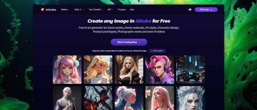 Aitubo – це програма, яка використовує штучний інтелект для створення творів мистецтва на основі наданого користувачем тексту та зображень. Користувачі можуть перетворювати свої малюнки на витвори мистецтва за допомогою вбудованого генератора зображень зі штучним інтелектом. Це веб-інструмент, який використовує штучний інтелект для швидкого і легкого створення таких ресурсів, як ігрові персонажі та привабливі мультфільми, використовуючи готові моделі, створені експертами в цій галузі. Платформа включає бібліотеку моделей з різноманітними моделями, генератор штучного інтелекту для ефективного створення ресурсів для побудови ігрового світу, а також редактор штучного інтелекту, який допомагає користувачам робити більш точні редагування зображень. Ігрові ресурси, архітектурні ефекти, динаміку персонажів, тривимірну глибину різкості та багато іншого можна створювати за допомогою ескізу або фотографії.