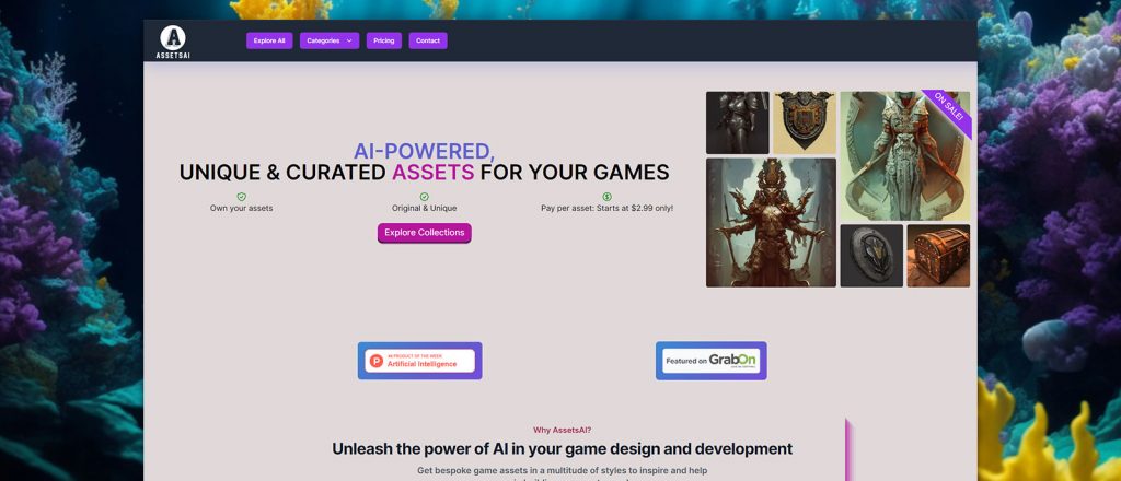AssetsAI – це бібліотека ігрових ресурсів на основі штучного інтелекту, яка надає розробникам і гравцям доступ до високоякісного, унікального контенту. Клієнти можуть придбати постійний доступ до ресурсів всього за $2.99. Щотижня до бібліотеки додаються такі ресурси, як зброя, обладунки, герби, молоти, мечі, клинки, щити, персонажі, космічні кораблі та скрині. Колекція також регулярно поповнюється новими лімітованими виданнями. Веб-сайт бібліотеки та система класифікації ресурсів добре продумані та зрозумілі.