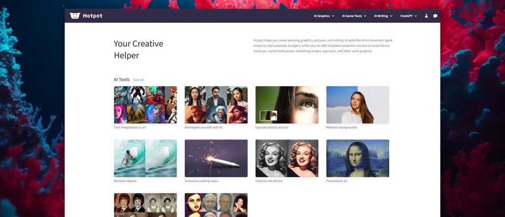 Hotpot.ai – це адаптивна програма з декількома функціями, керованими штучним інтелектом, які допомагають у творчих починаннях. Ця платформа допоможе вам створювати різноманітний візуальний і текстовий контент, а не лише ігрові ресурси. Ігрові дизайнери, маркетологи та художники можуть скористатися цим інструментом. Генератор мистецтв зі штучним інтелектом на платформі стане в нагоді саме для цього. На додаток до продуктів AI Headshot Generator, AI Copywriting і AI Image, він також пропонує широкий спектр продуктів зі штучним інтелектом. Ці опції можуть заощадити багато часу при створенні відеоігор, адже створення оригінальних високоякісних матеріалів – справа виснажлива.